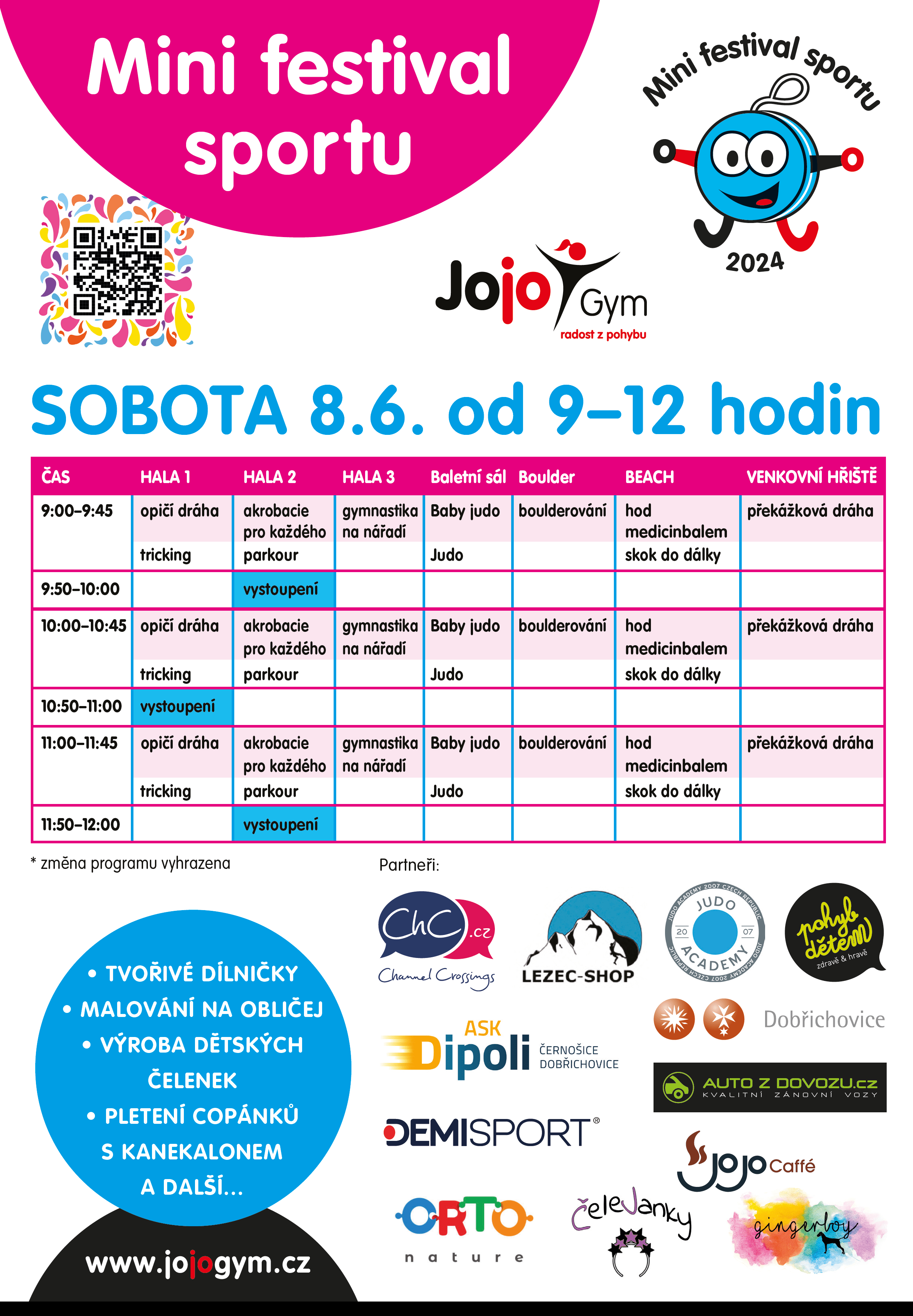 Připravujeme pro Vás 3. ročník Mini festivalu sportu, který proběhne dne 8. 6. 2024 od 9:00 – 12:00 hodin. Pod dohledem trenérů si vyzkoušíte gymnastiku i akrobacii v moderních a špičkově vybavených halách s velkou molitanovou jámou, hrazdou, kladinou, trampolínovým pásem a dalším vybavením. Kromě sportovního programu se můžete těšit i na pestrý doprovodný program.