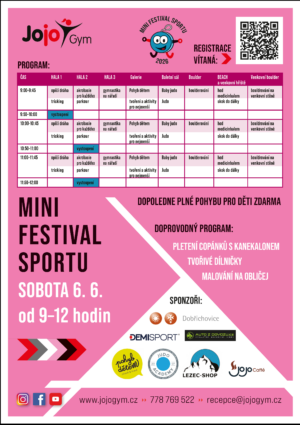 Mini festivalu sportu letos proběhne v sobotu 6. 6. 2026 od 9:00 – 12:00 hodin v prostorách Jojo Gymu. Pod dohledem trenérů si vyzkoušíte gymnastiku, parkour a tricking, judo i akrobacii v moderních a špičkově vybavených halách s velkou molitanovou jámou, hrazdou, kladinou, trampolínovým pásem a dalším vybavením. Letos nově i venkovní Bouderovou stěnu. Kromě sportovního programu se můžete těšit i na pestrý doprovodný program.