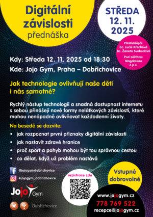 Zveme Vás na přednášku na téma Digitální závislosti (sociální sítě, hry apod.). V dnešní digitální době se závislosti netýkají jen alkoholu, cigaret nebo drog. Rychlý nástup technologií a snadná dostupnost internetu s sebou přinášejí nové formy nelátkových závislostí, které mohou nenápadně ovlivňovat naše děti i nás samotné. Připravili jsme pro vás rady i praktické tipy, jak k digitálním technologiím přistupovat, nebo co dělat, když už se rýsuje problém.