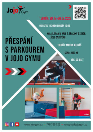 Přespi s námi v Jojo Gymu 29. – 30. května 2026, prostor naplno využijeme k parkourovým trikům. Po celou dobu programu se Ti budou věnovat trenéři Martin s Lukášem. Zajištěno je jídlo, pitný režim a spaní v hale 2, prosíme spacáky s sebou. Vhodné pro děti od 9 let.