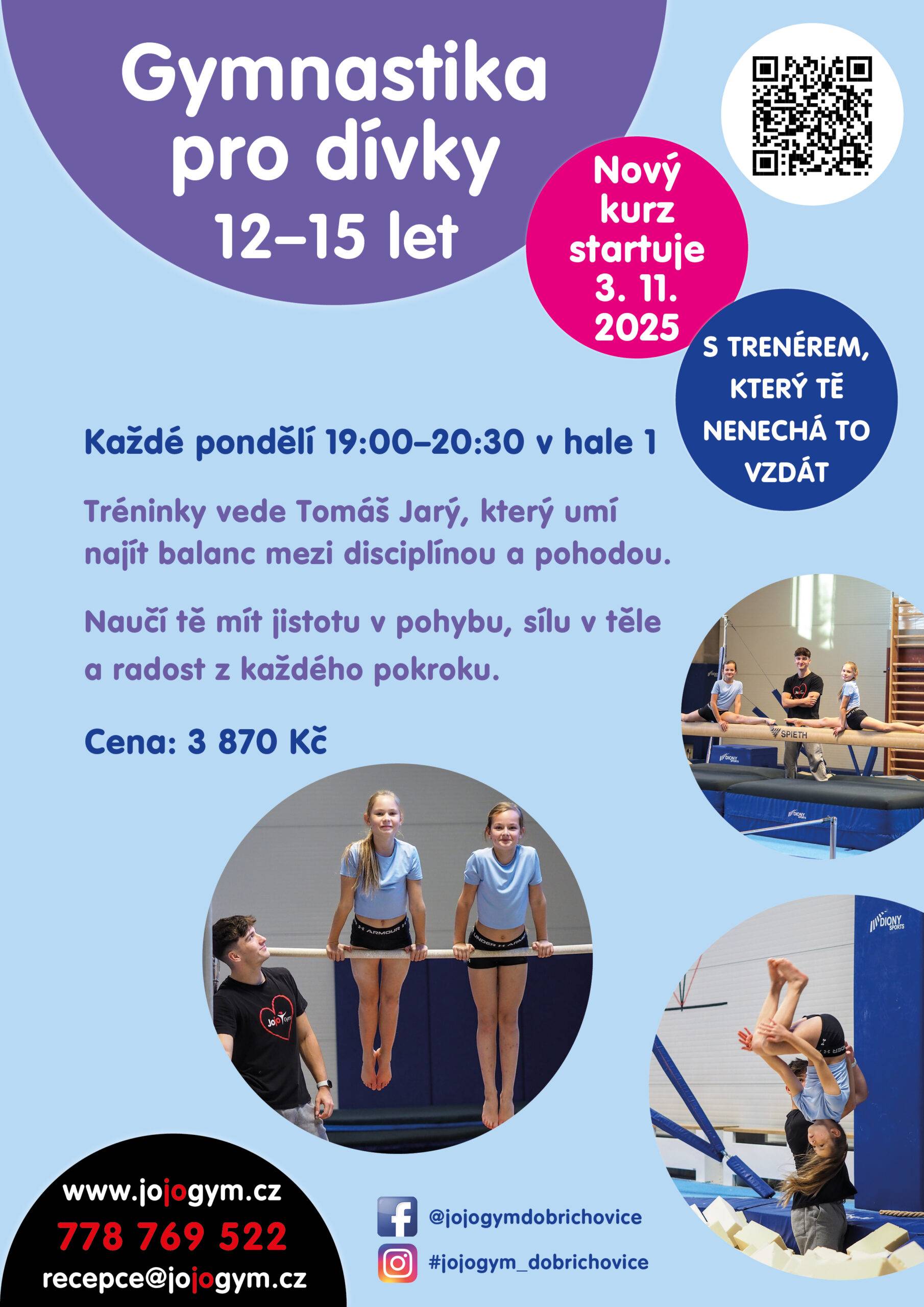 Pro velký zájem přidáváme kurz Gymnastika pro dívky 12–15 let. Kurz bude probíhat každé pondělí od 3.11.2025 v gymnastické hale 1 v čase od 19:00 – 20:30 hodin.