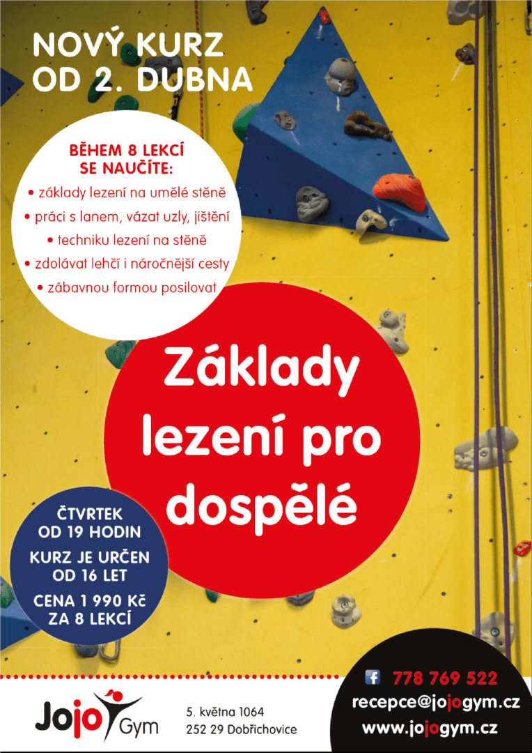 Rozšiřujeme nabídku kurzů pro dospělé. Přijďte se naučit základům lezení na umělé stěně ve zkráceném kurzu. Každý čtvrtek od 19 hodin se Vám bude věnovat trenérka s dlouholetou praxí v lezení Katka Silvičková. Začínáme v dubnu, ale hlásit se můžete už teď. Více informací na letáku.
