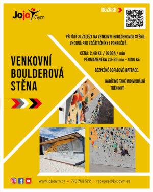 Sportovní centrum Jojo Gym rozšířilo svou nabídku o novou venkovní boulderovou stěnu, která nabízí atraktivní sportovní vyžití pro děti, mládež i dospělé. Bouldering je moderní forma lezení v menší výšce bez použití lana. Bezpečnost zajišťují měkké dopadové matrace, díky nimž je tento sport přístupný i začátečníkům.