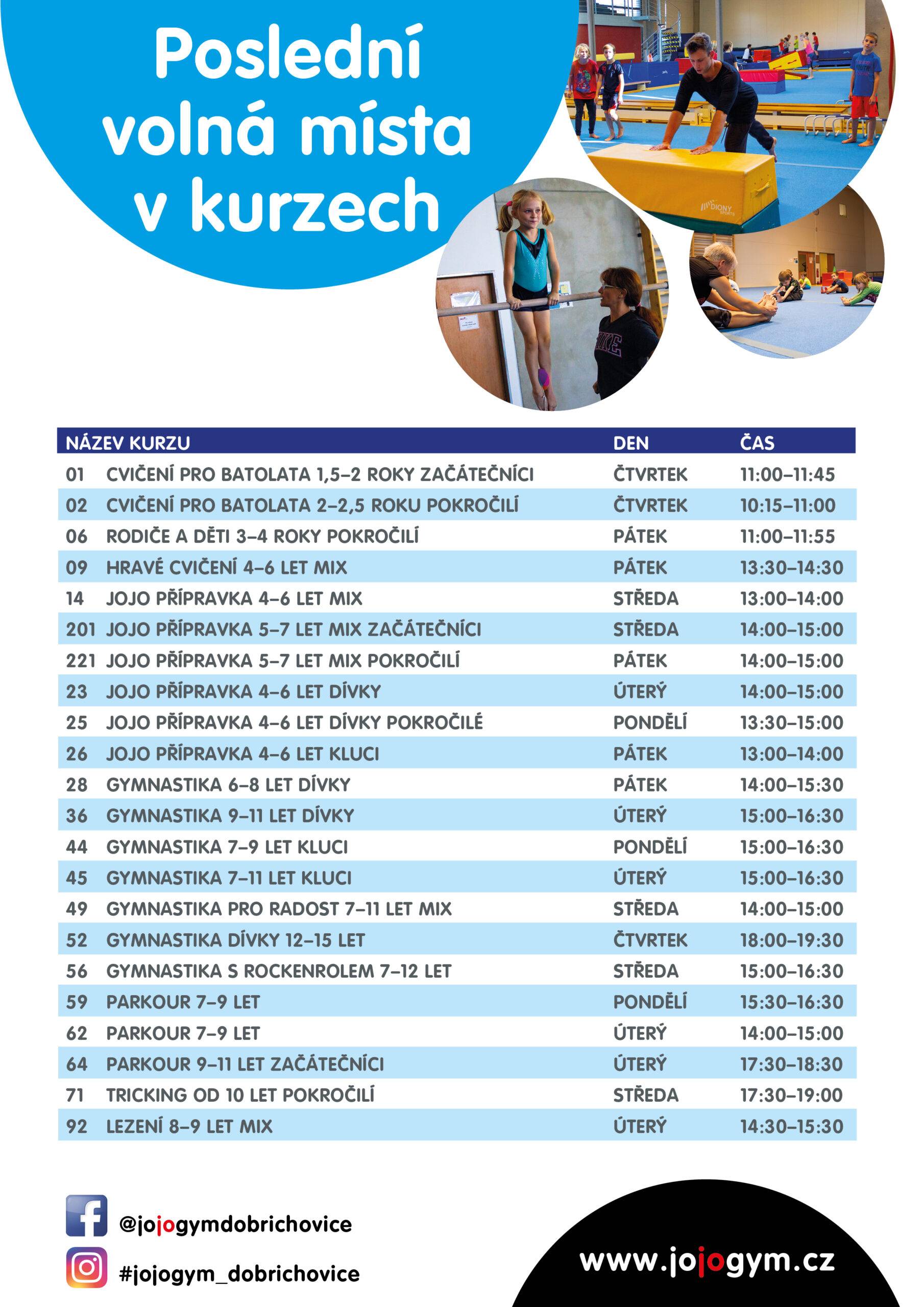 Stále se k nám můžete připojit na cvičení. Vytipovali jsme kurzy, kde jsou ještě volná místa. Pro velký zájem jsme vámi oblíbené kurzy dokonce přidali. Těšíme se společně v hale na tréninku na viděnou.