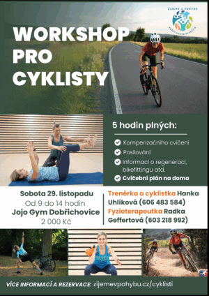 Workshop pro cyklisty se koná v sobotu 29. listopadu v baletním sále v Jojo Gymu od 9:00 -14:00 hodin pod vedením trenérky a cyklistky Hanky Uhlíkové a fyzioterapeutky Radky Geffertové.